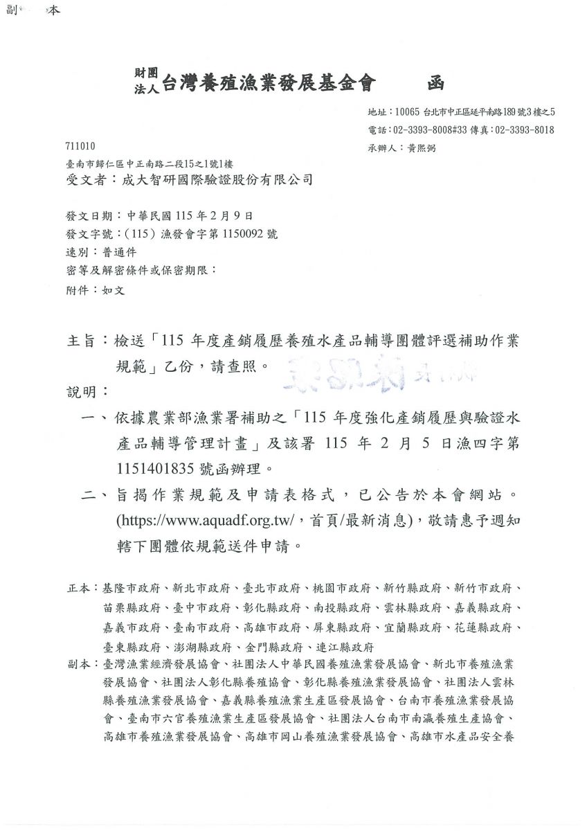 【轉知】021-財團法人台灣養殖漁業發展基金會 115年度產銷履歷養殖水產品輔導團體評選補助作業規範