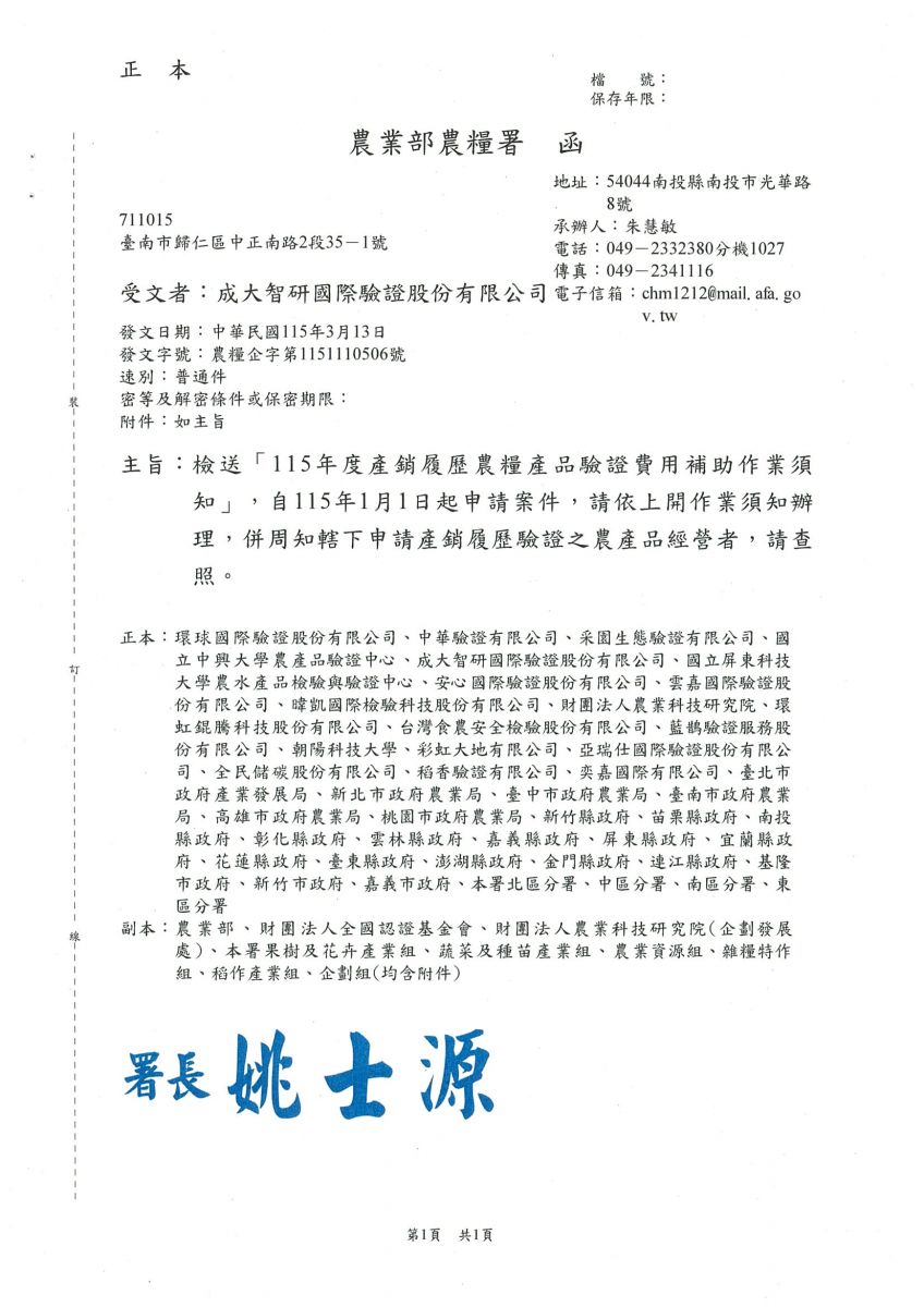 【轉知】040-農業部農糧署 115年度產銷履歷農糧產品驗證費用補助作業須知