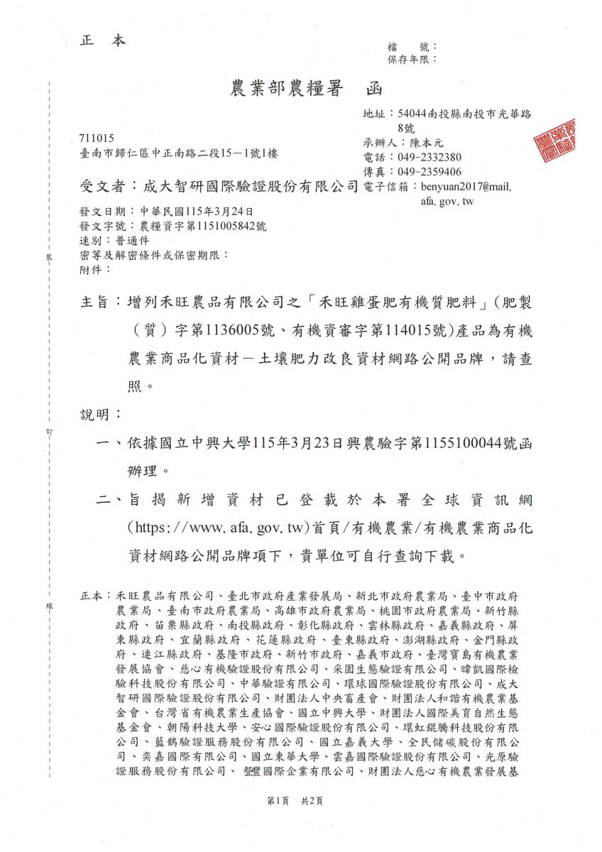 【轉知】045-農業部農糧署 增列禾旺農品有限公司之「禾旺雞蛋費有機質肥料」產品為有機農業商品化資材-土壤肥力改良資材網路公開品牌