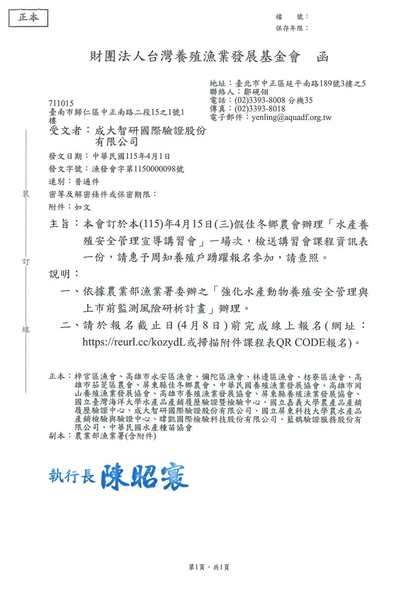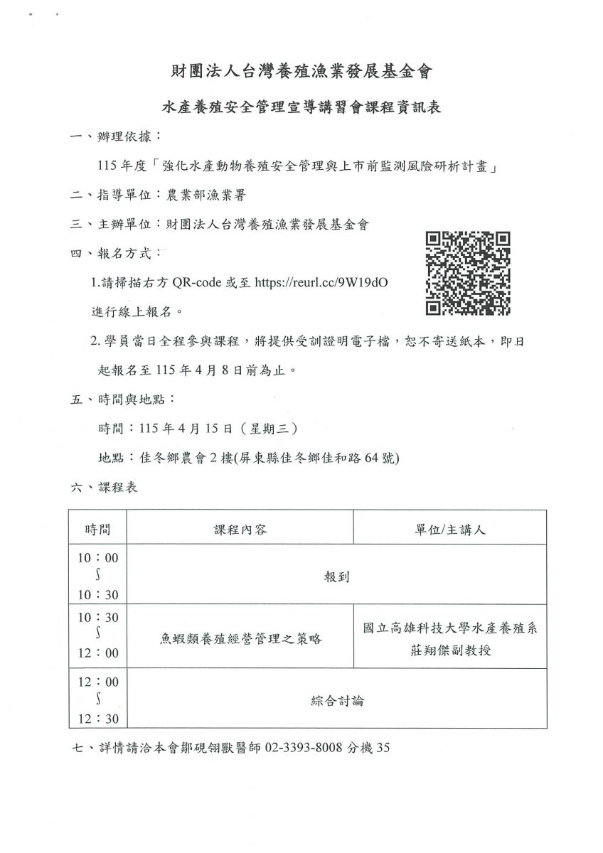 【轉知】048-財團法人台灣養殖漁業發展基金會 辦理「水產養殖安全管理宣導講習會」