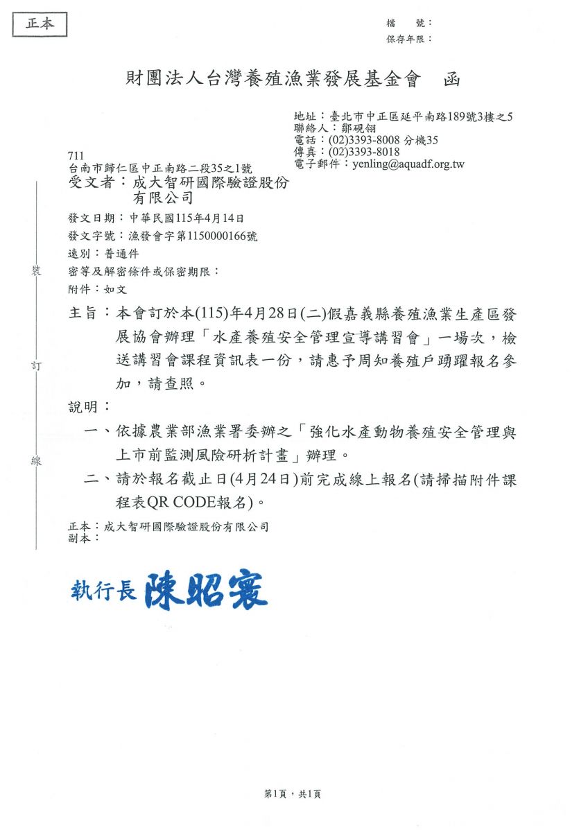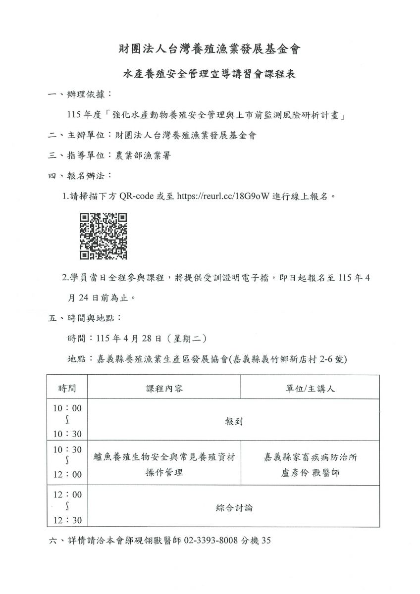 【轉知】054-財團法人台灣養殖漁業發展基金會 辦理「水產養殖安全管理宣導講習會」