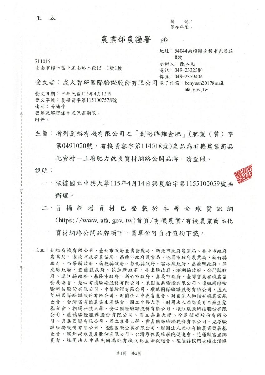【轉知】060-農業部農糧署 增列創裕有機有限公司之「創裕牌雞金肥」產品為有機農業商品化資材-土壤肥力改良資材網路公開品牌