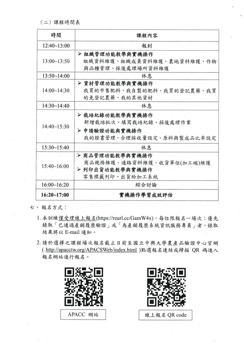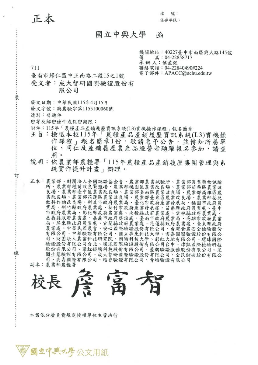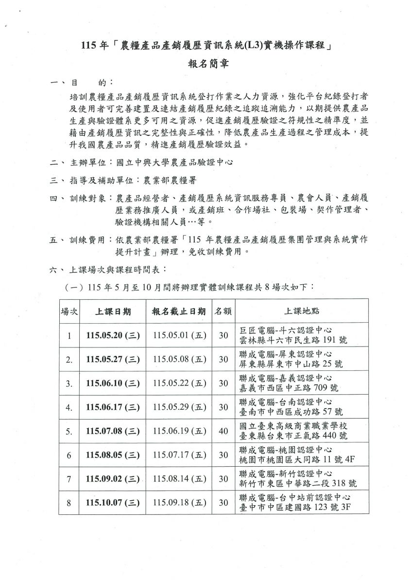 【轉知】063-國立中興大學 辦理「農糧產品產銷履歷資訊系統(L3)實機操作課程」