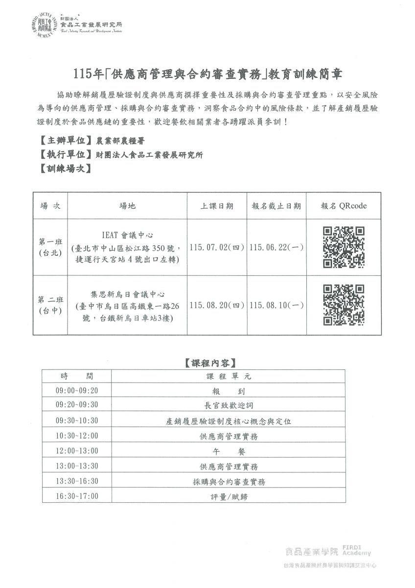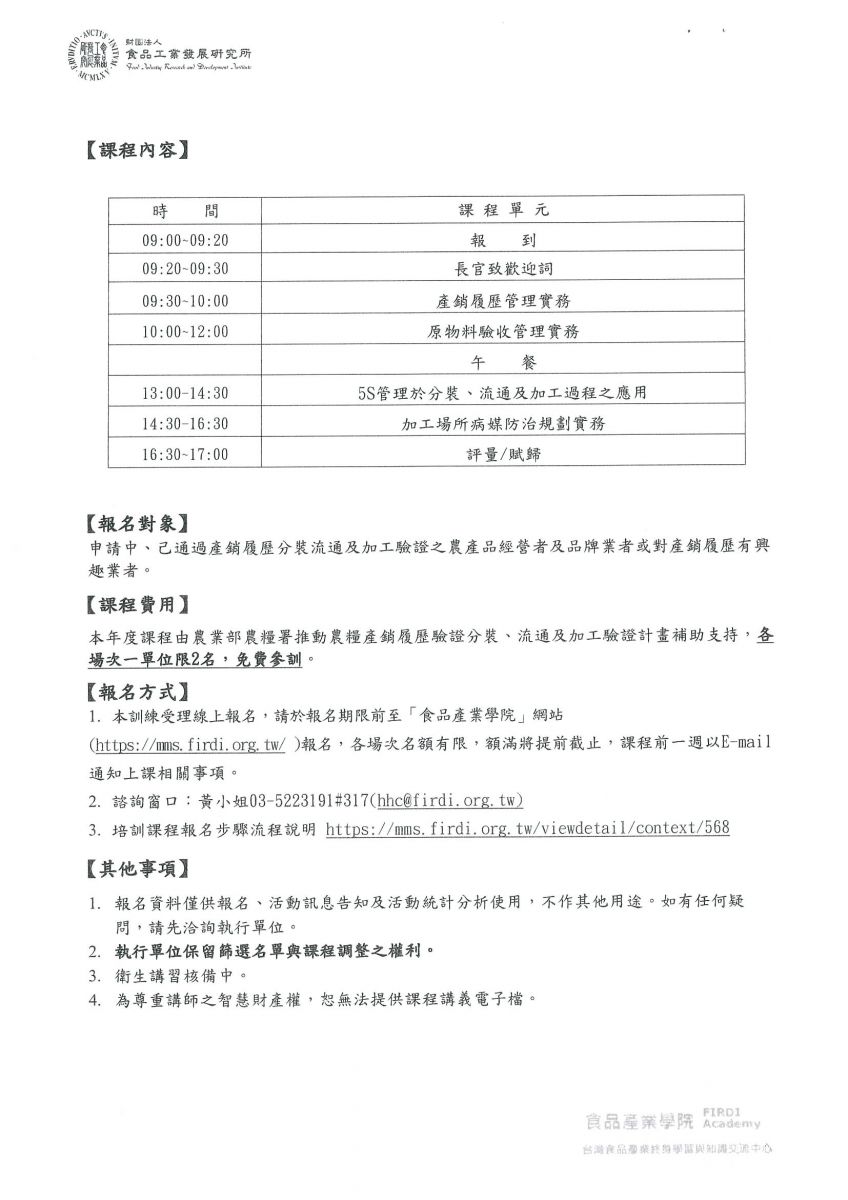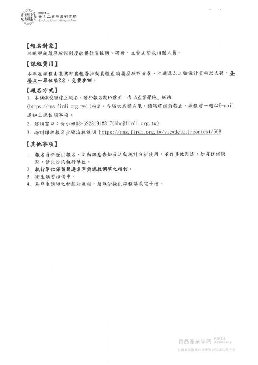 【轉知】068-財團法人食品工業發展研究所 辦理之「食品加工業者自主管理實務」、「供應商管理與合約審查實務」、「數位表單於製程及溯源管理應用實務」