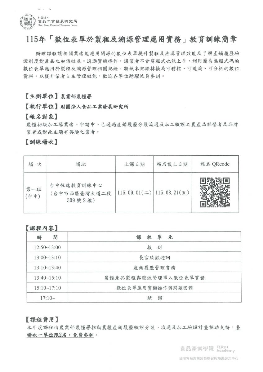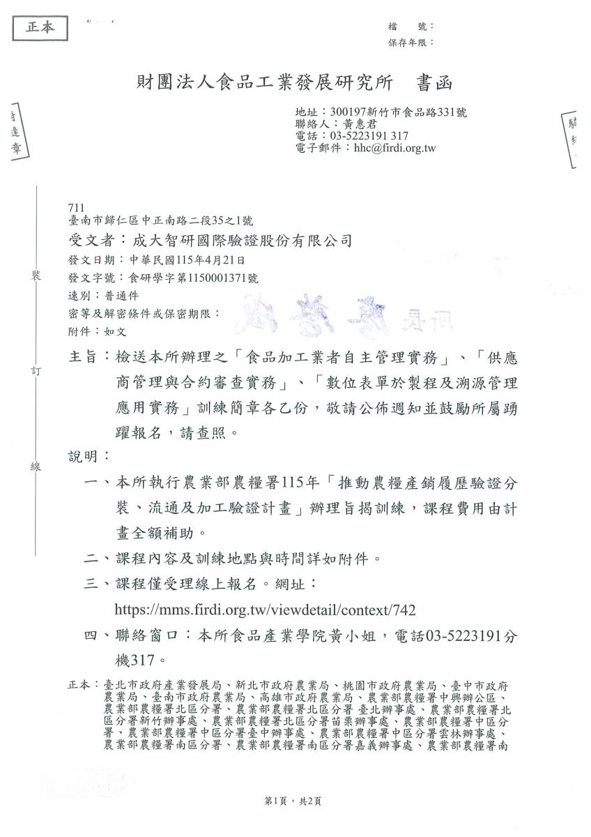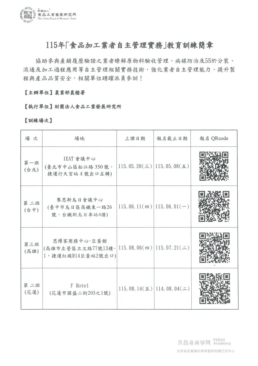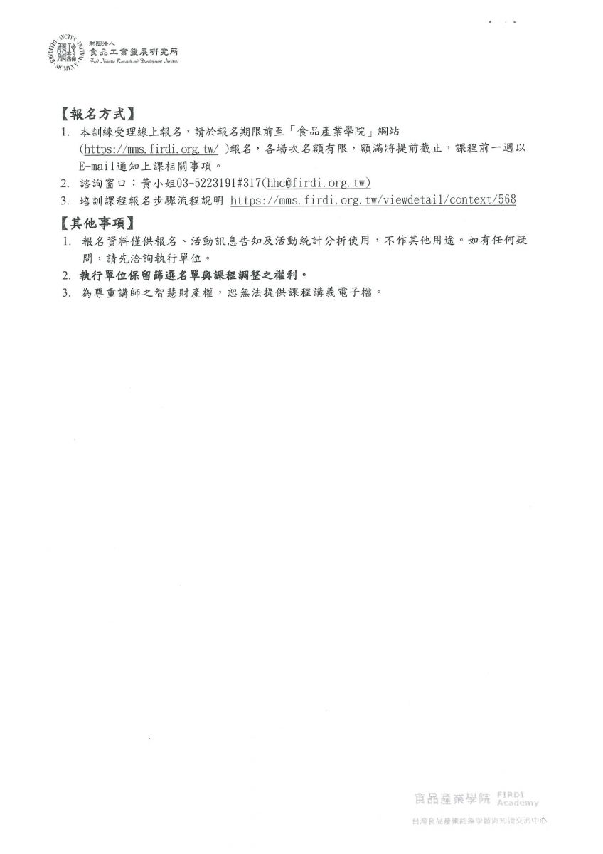 【轉知】068-財團法人食品工業發展研究所 辦理之「食品加工業者自主管理實務」、「供應商管理與合約審查實務」、「數位表單於製程及溯源管理應用實務」